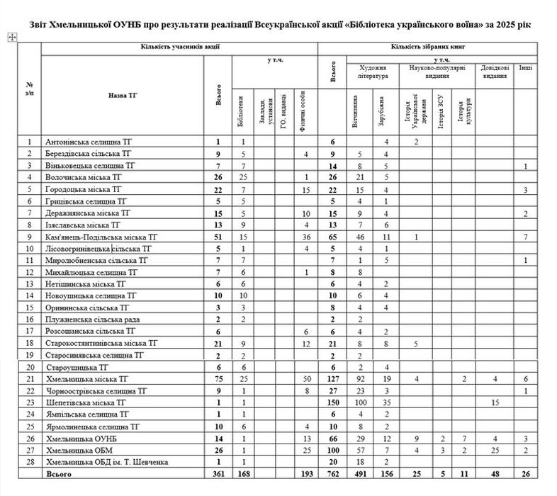 Загальна кількість зібраних книг – 762 примірники, у т.ч.:
