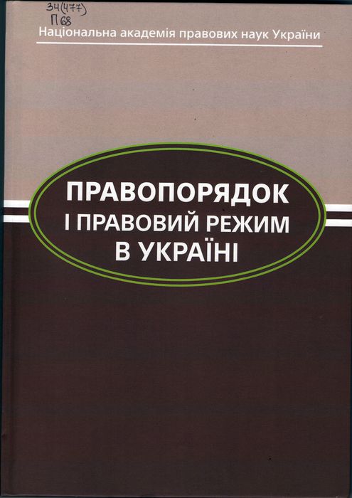 Б52604 34(477) П68 Правопорядок і правовий режим в Україні : наук. моногр. / Нац. акад. правових наук України ; кер. авт. кол. А. О. Селіванов. – Київ : Логос, 2022. – 292 с. У колективній науковій монографії авторський колектив вчених-юристів з університетів і юридичних факультетів досліджує правову природу і спрямованість правопорядку та правового режиму як базових категорій республіканського конституціоналізму і вперше розглядає їх сутність як одних із важливих принципів української державності.
