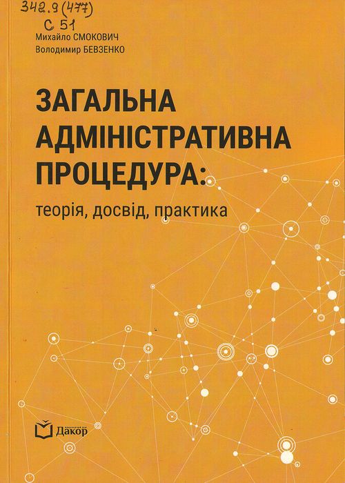 А47768 342.9(477) С51 Смокович М. Загальна адміністративна процедура: теорія, досвід, практика : навч. посіб. / М. Смокович, В. Бевзенко. – Київ : Дакор, 2025. – 132 с. У навчальному посібнику на основі Закону України «Про адміністративну процедуру» від 17.02.2022 року № 2073-IХ, теорії загального адміністративного права описано: сутність і зміст загальної адміністративної процедури, рішення, дії, бездіяльності адміністративних органів, суб?єктів і стадій загальної адміністративної процедури. Зроблено огляд співвідношення загальної й особливої адміністративної процедури, видів загальної адміністративної процедури.