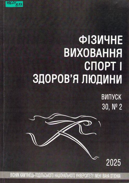 П1039-30(2)(2025) 796.01 В53 Вісник Кам`янець-Подільського національного університету імені Івана Огієнка Фізичне виховання, спорт і здоров’я людини. Вип. 30. № 2 : зб. наук. пр. / Кам`янець-Поділ. нац. ун-т ім. Івана Огієнка ; гол. ред. Г. А. Єдинак. – Кам`янець-Подільський : Панькова А. С., 2025. – 52 с. У віснику висвітлюються результати наукових досліджень з актуальних проблем, що пов’язані з педагогічними аспектами фізичного виховання різних груп населення, валеології, ерготерапії, підготовки спортсменів та менеджменту у фізичній культурі. Матеріали друкуються в авторській редакції. Рекомендовано науковим, науково-педагогічним працівникам, вчителям фізичної культури, основ здоров’я, тренерам з видів спорту, фахівцям з фізичної терапії, докторантам та аспірантам.