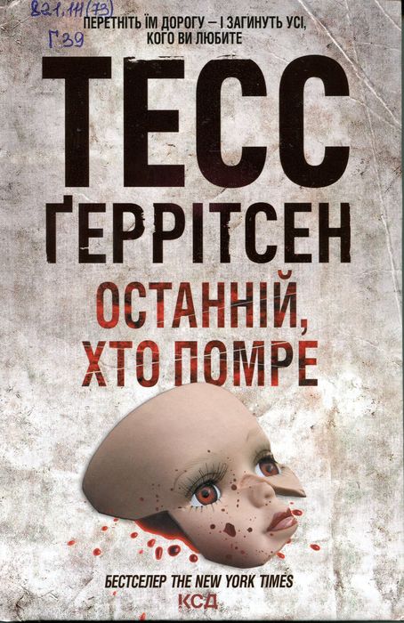 П1309-10 821.111(73) Г39 Геррітсен, Тесс. Останній, хто помре : роман. [Кн. 10] / Т. Геррітсен ; пер. з англ. А. Саженюк. - Харків : Клуб Сімейного Дозвілля , 2023. - 384 с. Троє підлітків опиняються в одній школі. Жахлива трагедія зруйнувала життя кожного з них. Сім’ю Тедді було вбито на борту власної яхти під час навколосвітньої подорожі. Батьків Клер застрелили в автомобілі. Родина Віла загинула в авіатрощі. Кожен із цих дітей — єдиний, хто вцілів зі всієї родини. Але чи надовго?