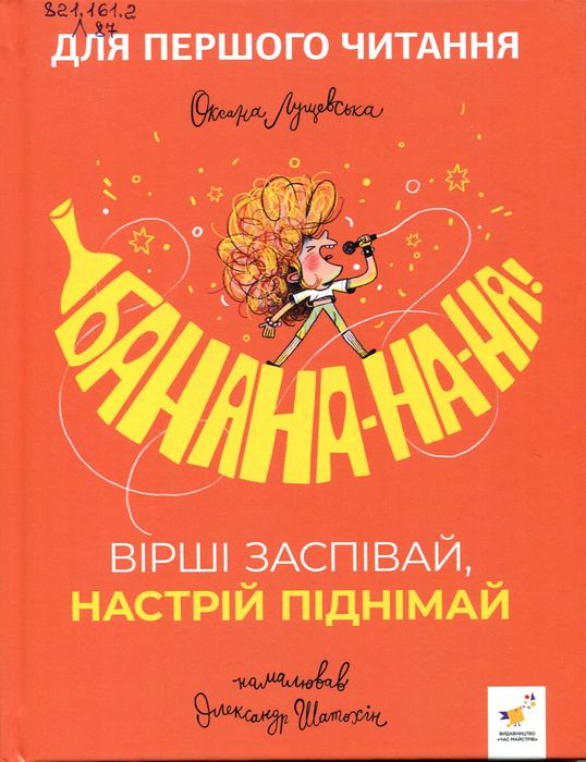 Б52644 821.161.2 Л87 Лущевська, О. В. Банана-на-на! Вірші заспівай, настрій піднімай / О. В. Лущевська ; худ. О. Шатохіна. – Київ : Час майстрів, 2025. – 40 с. : іл. – (Державна програма – 2025). Ця книжка – для першого читання, саме тому: - це веселі вірші; - у ній всього по кілька рядків на сторінці; - кожен вірш із неї покладено на музику, адже слова пісні мимоволі залишаються в пам’яті, а знайомий текст читається щоразу легше й швидше. Ці пісні залишаться з дитиною і після прочитання книжки, тому що: - вони піднімають настрій, розганяють сум, нерішучість, страх – усі негативні емоції, які першокласники можуть відчути в новому для них середовищі школи; - плейліст «Банана-на-на» на ютубі – своєрідний «якір» гарного настрою, антистрес-інструмент, який можна задіяти самостійно в будь-який час.