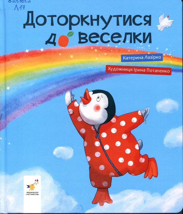 Б52631 821.161.2 Л17 Лазірко, К. Доторкнутися до веселки / К. Лазірко ; худож. І. Потапенко. - Київ : Час майстрів, 2025. – 48 с. : іл. кольор. – (Державна програма – 2025) Чарлі з дитинства мріє літати, ще відтоді, як тільки-тільки вилупився з яйця маленьким пташенятком, але є одна проблема: Чарлі — пінгвін. А пінгвіни, як відомо, не літають. І головному герою книжки весь час про це говорили… Але пінгвінчик Чарлі покаже, що ВСЕ МОЖЛИВО! Мрії люблять, коли їх не полишають, тоді вони здійснюються.
