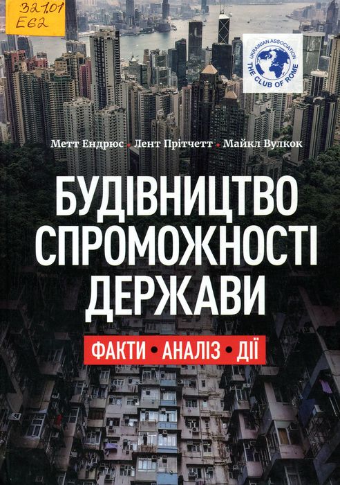 Б52679 321.01 Е62 Ендрюс, М. Будівництво спроможності держави. Факти. Аналіз. Дії / М. Ендрюс, Л. Прітчетт, М. Вулкок ; пер. з англ. Є. Плахути. – Київ : Саміт-книга, 2021. – 392 с. Цю книгу ми присвячуємо людям дії, – тим, хто кожного дня, прокидаючись, намагається змінити світ на краще. Тим, хто прагне, аби дійсно запрацювали системи, які мали би працювати, і тим, хто виконує свою роботу, долаючи перешкоди. Ми сподіваємось, що наш скромний внесок допоможе людям дії – ми пропонуємо системний підхід і понятійний апарат, аби узагальнити те, що найуспішніші з них інтуїтивно вже і так розуміють. Він пояснить, чому діяти буває так складно, і допоможе розбудувати ширшу спільноту людей дії, здатних робити реальні кроки на шляху до мети.