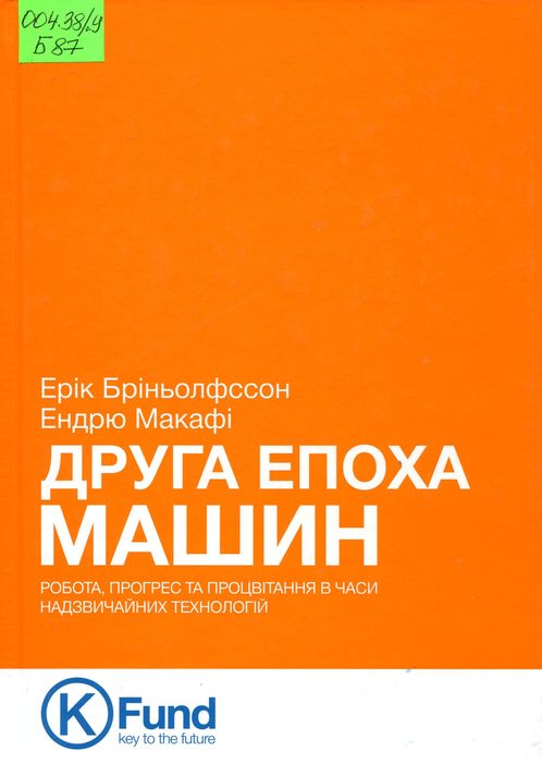 Б52668 004.38/.9 Б87 Бріньолфссон, Е. Друга епоха машин: робота, прогрес та процвітання в часи надзвичайних технологій / Е. Бріньолфссон, Е. Макафі. – Київ : K.FUND, 2016. – 236 с. У цьому бестселері (за версією найкращих західних видань The New York Times, The Wall Street Journal та The Washington Post) досліджується вплив технологій на наше життя. Ерік Бріньолфссон і Ендрю Макафі з Массачусетського технологічного інституту впроваджують термін «друга епоха машин» для визначення науково-технічних досягнень, які трансформують реальність. Серед них – поява комп’ютера і цифрових рішень як каталізаторів збільшення фізичних та інтелектуальних можливостей людства. Наше завтра – це битва за робочі місця з машинами. Виграє той, хто володіє унікальними навичками та швидко адаптується до змін.