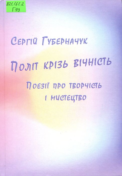 Б52541 821.161.2 Г93 Губерначук, С. Г. Політ крізь вічність : поезії про творчість і мистецтво / С. Г. Губерначук. – Київ : ТРОПЕА, 2025. Книгу українського поета Сергія Губерначука (1969–2017) склали вірші, присвячені поетичній творчості та мистецтву взагалі як досконалості і високій майстерності в будь-якому творінні. Поет був закоханий у життя і поезію. Саме ця збірка розкриває його власні душевні поривання і прагнення до творчості, до вираження словом і вдалими художніми образами багатого внутрішнього світу кожного справжнього поета і митця – світу, в який з усіляким новим твором вливаються радощі і печалі, страждання і саме життя. Читачу пропонується заглибитися у неповторний мистецький світ, насолодитися красою мови, помилуватися внутрішнім світом автора, багатством його почуттів і відтінків настрою, відчути витончену і чутливу душу поета.
