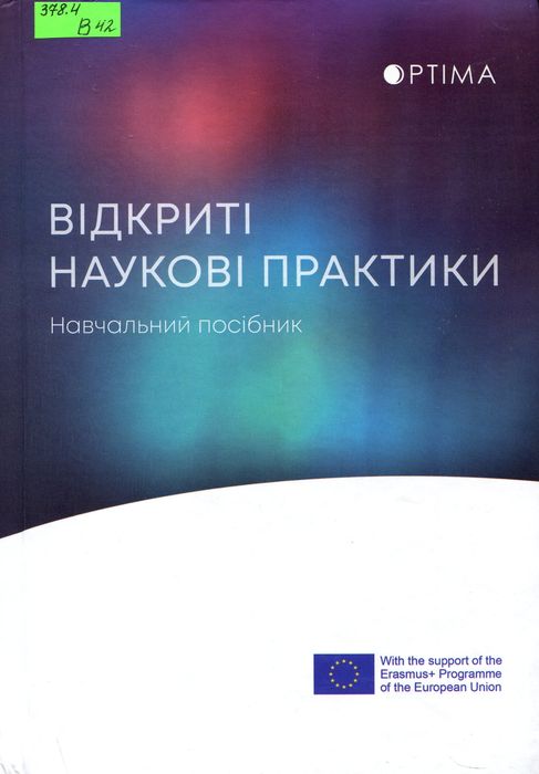 Б52547 378.4 В42 Відкриті наукові практики : навч. посіб. / А. Артюхов, Н. Артюхова, О. Березко [та ін.] ; OPTIMA проєкт «Відкриті практики, прозорість та доброчесність для сучасної вищої школи». – Житомир : Бук-Друк, 2024. – 400 с. Цей посібник є результатом проєкту OPTIMA (Відкриті практики, прозорість та доброчесність для сучасної вищої школи). В ньому зібрано матеріали з відкритої науки, орієнтовані на практичне навчання у відкритому освітньому середовищі для покращення рівня прозорості наукових досліджень. Цей посібник насамперед призначений для здобувачів другого та третього рівнів освіти (магістерського та освітньо-наукового), які планують упроваджувати принципи і практики відкритої науки під час проведення досліджень у різних галузях, зокрема в інформаційних та природничих науках і технологіях. Автори повністю усвідомлюють важливість розвитку відповідних знань та компетенцій на ранніх стадіях наукової кар’єри.