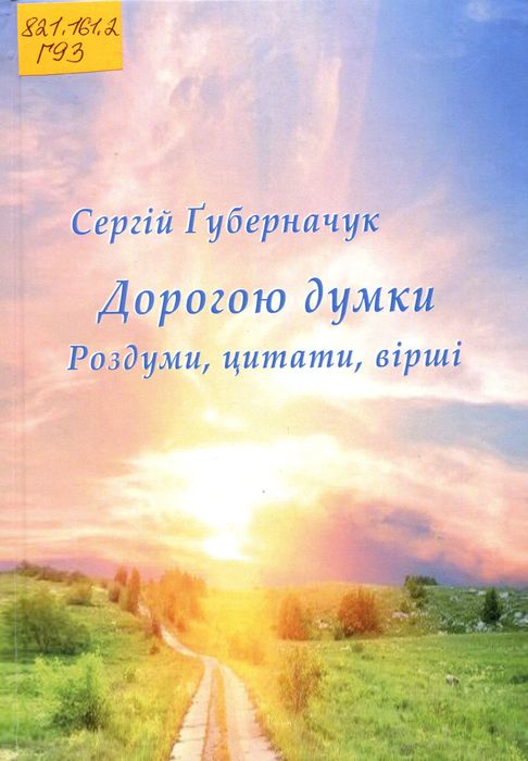Б52676 821.161.2 Г93 Губерначук, С. Г. Дорогою думки : роздуми, цитати, вірші / С. Г. Губерначук. – Київ : ТРОПЕА, 2025. – 220 с. Поезіям Сергія Губерначука притаманні виразність почуттів і переживань, насиченість глибокими ідеями та цікавими образами, поєднання живого художнього слова з творчим осмисленням змісту та філософськими роздумами. Книгу складено з цитат, нотаток, думок поета, які поділені за змістом на різні розділи. Представлені думки приваблюють сучасним поглядом, інтелектуальною глибиною, витонченістю та щирістю, нерідко – тонким дружнім гумором. Усі вони своєрідні й грунтовні, наповнені любов’ю до життя і людей. Книга звертається до кожного, хто замислюється про життя, суть речей, шукає їх розуміння, цінує майстерне влучне слово, мудру і досконалу думку.
