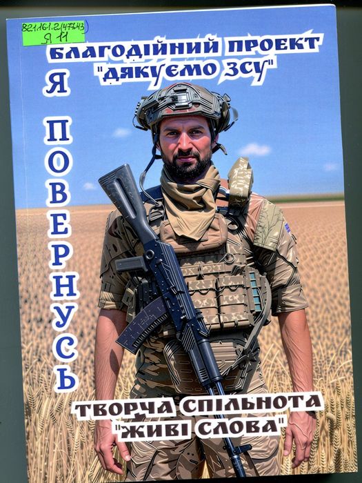 А47875 821.161.2(477.43) Я11 Я повернусь : альманах / Л. Нікіфорова, Я. Слободян та ін. – Київ : Прінтту, 2025. – 406 с. : фот. У виданні вміщені твори 75 авторів з різних куточків України, серед них – Ярослава Слободян з Ярмолинець. Поетична збірка наповнена почуттям гордості за воїнів російсько-української війни, котрі виборюють свободу і незалежність України.