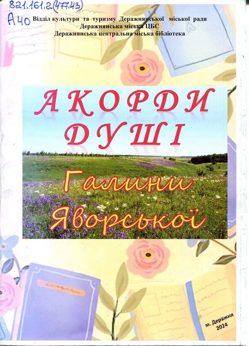 А47883 821.161.2(477.43) А40 Акорди душі Галини Яворської : літ.-худож. вид. / Від. культури та туризму Деражнян. міськради, Деражнян. міська ЦБС ; упоряд. О. Ковпак ; відп. за вип. Т. Сайпель. – Деражня : [б. в.], 2024. – 36 с. : фот. кольор. Літературне видання уродженки с. Явтухи на Деражнянщині вміщує вірші для дорослих та дітей.