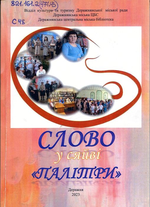 А47873 821.161.2(477.43) С48 Слово у сяйві «Палітри» : літ.-худож. альм. (до 30-літнього ювілею клубу «Палітра») / Від. культури та туризму Деражнян. міськради, Деражнян. міська ЦБС ; уклад. О. Ковпак ; відп. за вип. Т. Сайпель. – 2-ге вид., допов. – Деражня : [б. в.], 2023. – 140 с. : фот. кольор. У виданні вміщені відомості про діяльність літературно-мистецького клубу «Палітра», що діє при Деражнянській центральній міській бібліотеці.