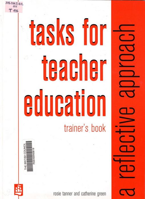 378.091.2:811.111 T198 Tanner, Rosie. Tasks for teacher education: trainer`s book (a reflective approach). – 3rd ed. – London, 1998. – 96 p. Посібник охоплює практичні теми для вчителів англійської мови у школі, такі як спостереження за класом, робота з помилками, планування уроків та викладання граматики. Містить глосарій термінів, що використовуються у викладанні та навчанні, а також пропозиції для подальшого опрацювання матеріалу на уроках англійської мови.