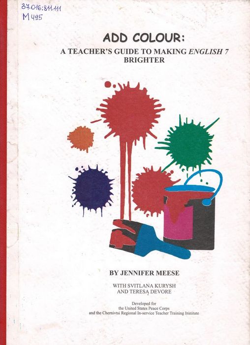 37.016: 811.111 M496 Meese Jennifer. Add colour: A teacher`s guide to making English 7 Brighter: підручник, 2000. – 184 p. Пропонований навчальний посібник для вчителів англійської мови містить теоретичний та практичний стислий курс для навчання англійської мови у 7 класах загальноосвітніх шкіл за підручником В. Плахотника, Р. Мартинової та необхідний роздатковий матеріал для організації навчання за комунікативними технологіями. Посібник складається із трьох розділів: поради щодо поурочного планування, загальні методи та прийоми навчання з поясненнями їх практичного впровадження в практику роботи, комунікативні прийоми, рольові ігри та роздатковий матеріал. В першому розділі включені рекомендації для проведення кожного уроку відповідно до підручника для 7 класу починаючи з мети і закінчуючи домашнім завданням. Корисною буде також інформація про граматичні та лексичні неточності у підручнику та шляхи їх корекції. Матеріал для другого та третього розділів добирався з найсучаснішої методичної літератури, про що можна дізнатись з бібліографії в кінці посібника.