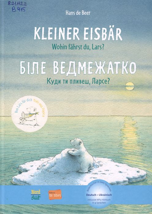821.112.2 B415 Beer, Hans de. Kleiner Eisbär : Wohin fahrst du, Lars? = Біле ведмежатко : Куди пливеш, Ларсе? – Zurich: NordSud Verlag, 2022. – 22 s. Біле ведмежа Ларс опиняється зовсім одне на маленькій крижині у відкритому морі. Коли крижина розтає, він рятується, забравшись на діжку, що пропливає неподалік. Починається небезпечна подорож. Нарешті Ларс потрапляє до Африки. Це, звісно, дуже захоплююче, але ведмежа сумує за своєю холодною білою Батьківщиною. На щастя, нові друзі, бегемот і косатка, допомагають йому повернутися додому.