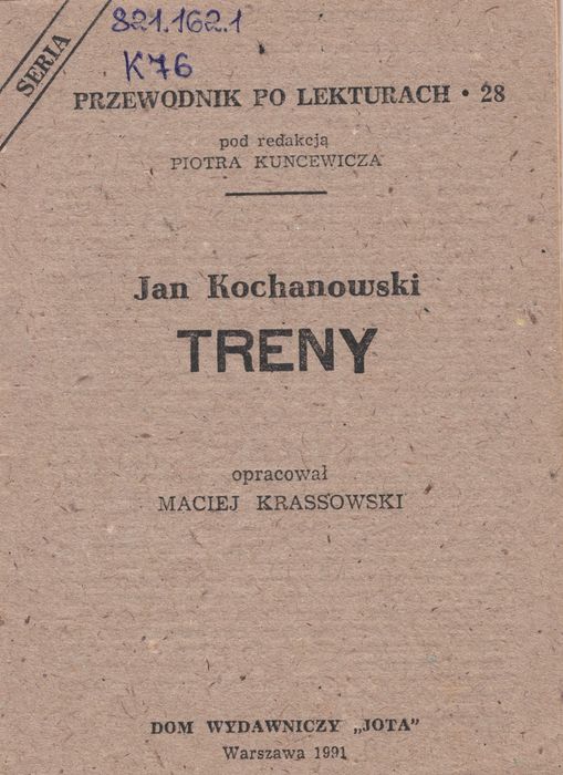 821.162.1 K76 Kochanowski, Jan. Treny : лекції. – Warszawa, 1991. – 44 s. «Плачі» Яна Кохановського – унікальний цикл елегій у польській літературі, написаний після смерті доньки поета Уршули. Композиція збірки демонструє історію філософської кризи, викликаної пережитим ударом. Трени насичені апострофами, коли слідом за загальними розміркуваннями йде звертання до якоїсь конкретної особи з-поміж слухачів чи до уявного образу, та риторичними питаннями.
