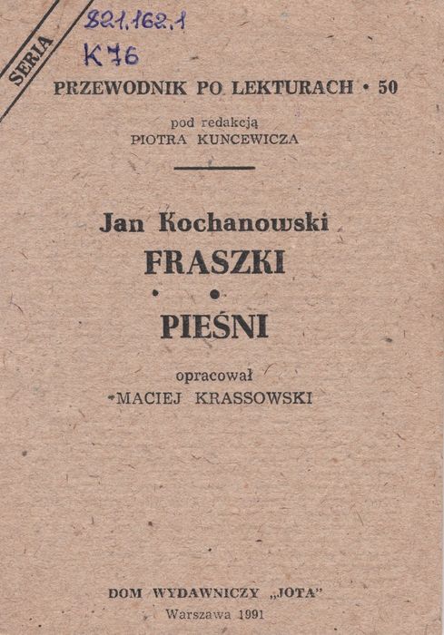821.162.1 K76 Kochanowski, Jan. Fraszki : piesni. – Warszawa, 1991. – 42 s. Неоспівані епіграми Яна Кохановського є багатим свідченням епохи надзвичайного значення в історії як польської, так і європейської культури. Звичайно, вони залишаються для нас живим, дихаючим літературним твором, який читаємо не лише з обов`язку. Перш за все, це література, але в цій збірці віршів, здебільшого коротких, як у мерехтливих відблисках дзеркала, ми знаходимо численні зображення ситуацій, подій, людей, свідчення їхніх думок і вчинків. Ці образи створюють панорамну картину соціальної, моральної та інтелектуальної культури Польщі XVI століття, невід`ємної, хоча й не позбавленої власних відмінних рис, частини Європи епохи Відродження.