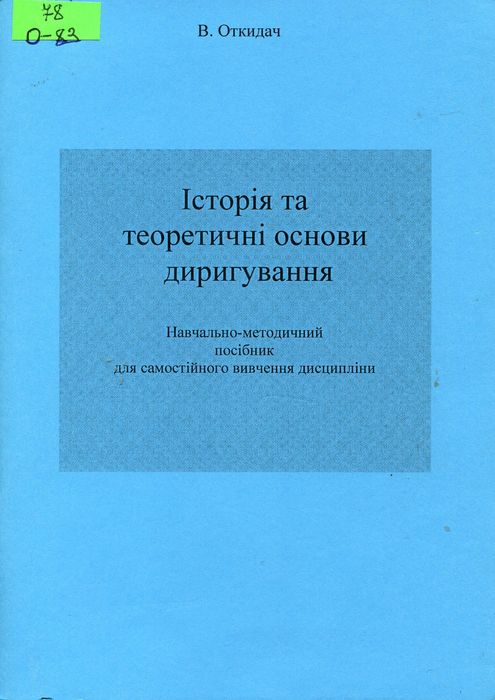 А47798 78 О-83 Откидач В. М.. Історія та теоретичні основи диригування : навч.-метод. посіб. / В. М. Откидач. – Харків : Форт, 2014. – 134 с. Посібник містить типову програму курсу, комплекс навчально-методичного забезпечення до кожної теми курсу, завдання для блочно-модульного контролю знань, тематику контрольних та курсових робіт, критерії оцінки знань студентів з дисципліни, а також список різноманітної літератури для поглибленого вивчення курсу. В допоміжних матеріалах подаються стислі дані про видатних диригентів різних країн, словник термінів і понять, інша інформація. Розрахований на студентів вузів і факультетів культури і мистецтв ІІІ – ІV рівня акредитації, які навчаються за навчальними планами підготовки бакалаврів і спеціалістів спеціалізацій «Оркестрові духові та ударні інструменти», «Музичне мистецтво естради». Стане у пригоді слухачам магістерських програм відповідних фахових спрямувань, які не мають базової освіти.
