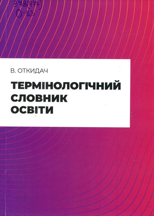 А47799 378(477) О-83 Откидач В. М. Термінологічний словник освіти / В. М. Откидач. – Харків : Міська друкарня, 2024. – 115 с. Нині вища освіта знаходиться на складному шляху оновлення та опанування новими світоглядами, поняттями, термінами. Зараз освітяни, викладачі вишів, здобувачі вищої освіти, магістри, науковці користуються термінологічною базою, яка активно застосовує арсенал видавничої справи, мистецтвознавства філософії, лінгвістики, педагогіки, психології, комп’ютерних технологій, діловодства, концертної діяльності. Всі ці процеси та явища можна розглядати єдиним потоком пізнання та опанування освіти крізь призму духовно-естетичного, соціально-культурного та науково-технічного розвитку суспільства. Даний словник адресований всім учасникам освітнього процесу, музикознавцям, культурологам, а також всім хто цікавиться та опікується заявленими проблемами.