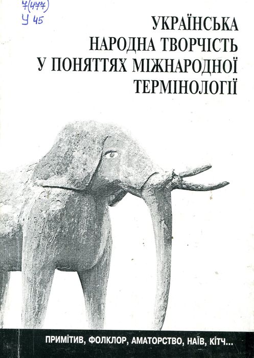А47864 7(477) У45 Українська народна творчість у поняттях міжнародної термінології (примітив, фольклор, аматорство, наїв, кітч...) : кол. дослідж. / Музей Івана Гончара, Ін-т мистецтвозн., фольклористики та етнології ім. М. Т. Рильського ; редкол.: О. Бріцина, П. Гончар, Л. Лихач та ін. ; відп. ред. М. Селічов. – Київ : Музей Івана Гончара, 1996. – 328 с. : іл., фот. На матеріалі декоративного й образотворчого мистецтва, музики, театру, словесності тощо розглядаються нез’ясовані та дискусійні проблеми поняттєво-термінологічного осмислення багатовікового розвитку народної творчості, її численних різновидів і видозмін у взаємозв’язках з академічним мистецтвом. Для мистецтвознавців, етнографів, фольклористів, естетиків і всіх зацікавлених народною культурою та її символікою.