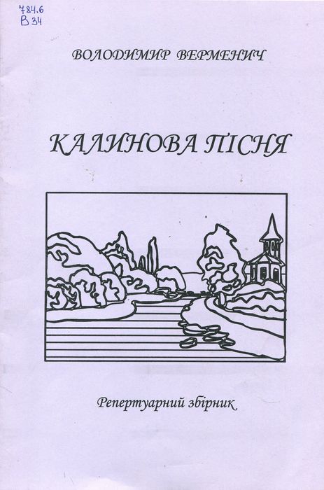 784.6-071.1 : 780.8(081) В34 Верменич В. М. Калинова пісня : репертуарний зб. / М. В. Верменич. – Київ : РННЦ «ДІНІТ», 2003. – 64 с. Даний репертуарний збірник буде добрим помічником музичним керівникам в дошкільних закладах, вчителям музики шкіл різного типу, викладачам і учням музичних шкіл та студентам музично-педагогічних факультетів університетів, інститутів та училищ, а також широкому колу шанувальників творчості композитора.