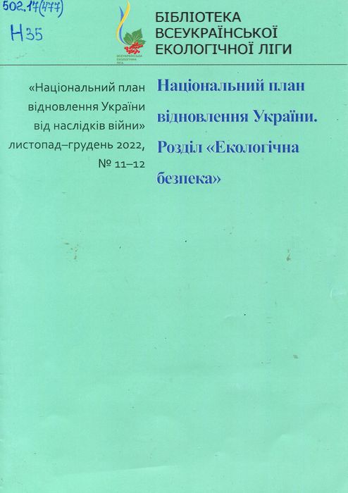 П1297-11-12(2022) Н35 Національний план відновлення України. Розділ "Екологічна безпека" " : / Всеукр. еколог. ліга ; гол. ред. Т. В. Тимочко. - Київ : Центр еколог. освіти та інформ., 2022. - 33 с. - (Бібліотека Всеукраїнської екологічної ліги) (Національний план відновлення України від наслідків війни ; листопад-грудень 2022, № 11-12). Впровадження завдань і проєктів Плану відновлення за напрямом екологічної безпеки забезпечить реалізацію екологічної політики відповідно до євроінтеграційного напряму розвитку України та Європейського зеленого курсу, а також інтеграцію екологічної складової до всіх реформ та проектів з відновлення країни відповідно до європейського курсу та засад сталого розвитку. Започатковано ключові реформи в довкілевих та кліматичних напрямах, розпочато зелену трансформацію економічного розвитку.