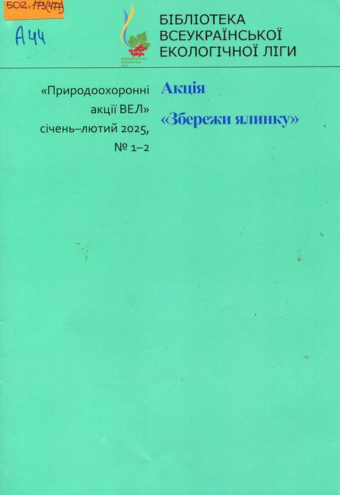 П1298-1-2(2025) 502.173(477) А44 Акція«Збережи ялинку» : / Всеукр. еколог. ліга ; гол. ред. Т. В. Тимочко. - Київ : Центр еколог. освіти та інформ., 2025. - 32 с. - (Бібліотека Всеукраїнської екологічної ліги) (Природоохоронні акції ВЕЛ ; січень-лютий 2025, № 1-2). Мета акції – схилити громадян України відмовитися від передноворічного винищення хвойних дерев та показати шкідливі наслідки передноворічного вирубування хвойних дерев. Акція спрямована на формування громадської думки про «ялинкову» проблему шляхом пропаганди заміни живих дерев на композиції з гілля. У цій збірці подано конкурсні роботи, інформаційно-методичні матеріали, що стосуються організації та проведення щорічного конкурсу «Замість ялинки – зимовий букет» в рамках проведення акції ВЕЛ «Збережи ялинку».
