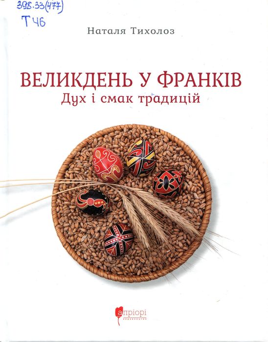 Б52620 398.33(477) Т46 Тихолоз, Наталя Богданівна. Великдень у Франків. Дух і смак традицій : / Н. Б. Тихолоз. - Львів : Апріорі, 2025. - 208 с. : фот., фот. кольор. - (Державна програма - 2025). Ця книга незвичний погляд на біографію одного з творців української ідентичності. Нестандартний жанр – культорологічна студія з гастрономічним додатком – дає змогу розповісти про живого Івана Франка без пафосу і глянцю, в інтер’єрі рідного дому, у колі родини, немовби зустрітися з ним віч–на–віч за святковим столом, щоб розкрити його особистість, світогляд і цінності крізь призму культури святкування Великодня. Воскресіння Христове постає не тільки як величне свято, а як символ єдності поколінь і перемоги життя над смертю. У розділі «Смаки Великодня: страви з фамільного зшитка» подано рецепти великодніх страв з архіву родини Івана Франка.