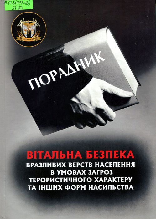 Б52608 614.8(477.43) Я99 Ящук, Петро Володимирович. Вітальна безпека вразливих верств населення в умовах загроз терористичного характеру та інших форм насильства : практ. порадник / П. В. Ящук ; Громад. орг. "Асоц. лікарів Хмельниччини", Наук.-практ. центр "Вітальна безпека". - Вінниця : Твори, 2025. - 104 с. : фот. Видання має інтегрований міжгалузевий характер, орієнтоване на реалізацію принципів вітальної безпеки, захист життя, здоров’я та психоемоційної стійкості вразливих груп населення в умовах надзвичайних ситуацій, зокрема терористичного характеру, а також у контексті загроз, зумовлених іншими формами насильства в кризових обставинах.