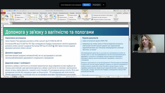 Анна Станіславівна проінформувала учасників про Закон України № 4681-IX «Про внесення змін до деяких законів України щодо підтримки сімей з дітьми та створення умов, які сприяють поєднанню материнства (батьківства) з професійною діяльністю» від 5 листопада 2025 року та Постанову Кабінету Міністрів України від 31 грудня 2025 р. № 1805 «Деякі питання надання державної допомоги сім’ям з дітьми», які вступили в дію з 1 січня 2026 року і наголосила, що новий закон передбачає як підвищення вже існуючих виплат, так і запровадження абсолютно нових видів державної допомоги та охоплює весь період — від вагітності майбутньої мами і до моменту, коли дитина йде до школи.