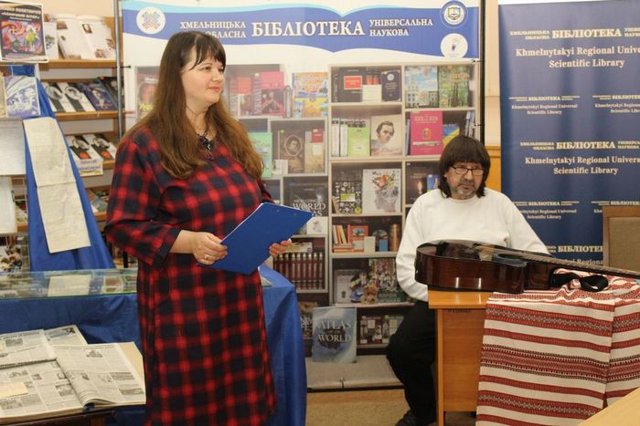 Вітання линули і від директорки бібліотеки Катерини Чабан, яка подарувала гостю рекомендаційний бібліографічний довідник «Календар знаменних і пам’ятних дат Хмельниччини», де вміщена інформація про Славка та стаття про нього, яку написав Віталій Міхалевський.