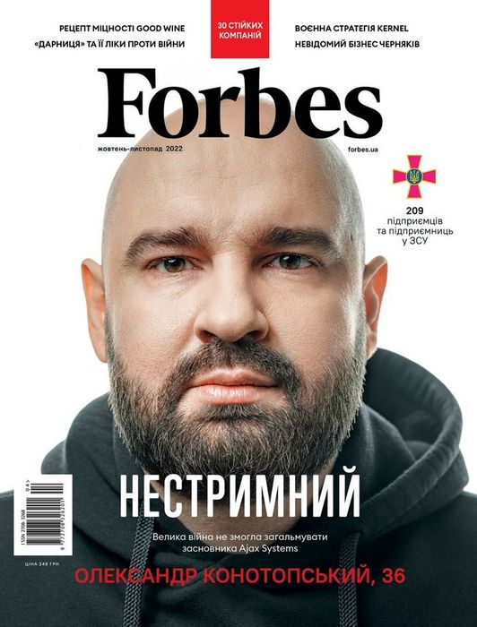 На обкладинці іншого випуску журналу «Forbes» – Олександр Конотопський, засновник Ajax Systems. За вісім місяців війни його бізнес зріс майже на 50%, компанія не втратила жодного замовника.